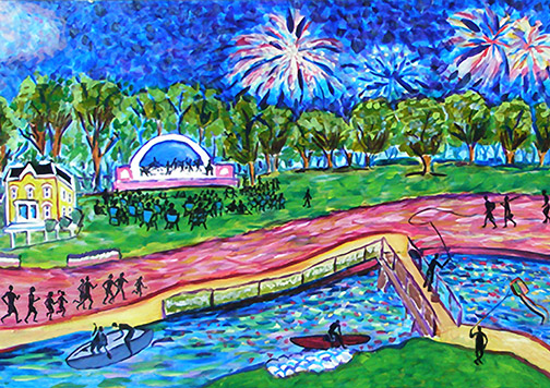 This scene also shows the Gardner House museum, on the left, and canoeing, kayaking, fishing, and other river activities, including the Albion River Trail, that is a part of several larger hiking trails. This view of summer in Albion, including the bandshell, is part of a 56-foot long mural in the drive -thru of former Huntington Bank in downtown Albion.